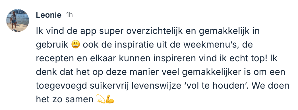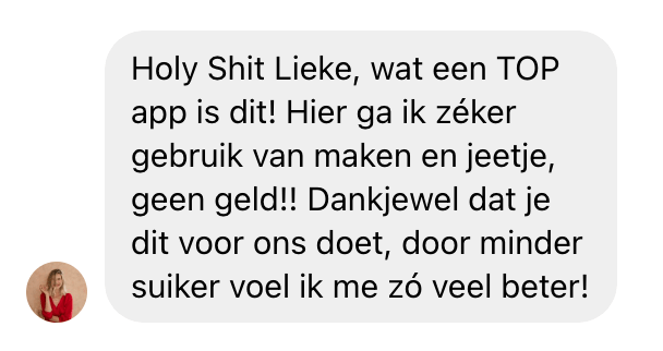 Natuurlijk! Het doel is niet nooit meer suiker eten. Het doel is een gezonde 80/20 balans creëren waarin suiker niet meer in je standaard basisvoeding zit, maar de lekkere uitzondering is waar je enorm van kunt genieten. Met de app helpen we je aan die gezonde, suikervrije basis en daarnaast kun je zelf je suikerrijke uitzonderingen kiezen (maar waarschijnlijk gaat de app je ook verrassen met hoeveel lekkers je daar vindt😉).